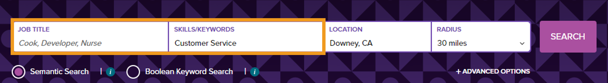 Just one entry is needed within the Job Title or Skills/Keywords fields to initiate a search. Location is not required, as it will default to Nationwide. Click on the +Advanced Options link to expand your criteria.