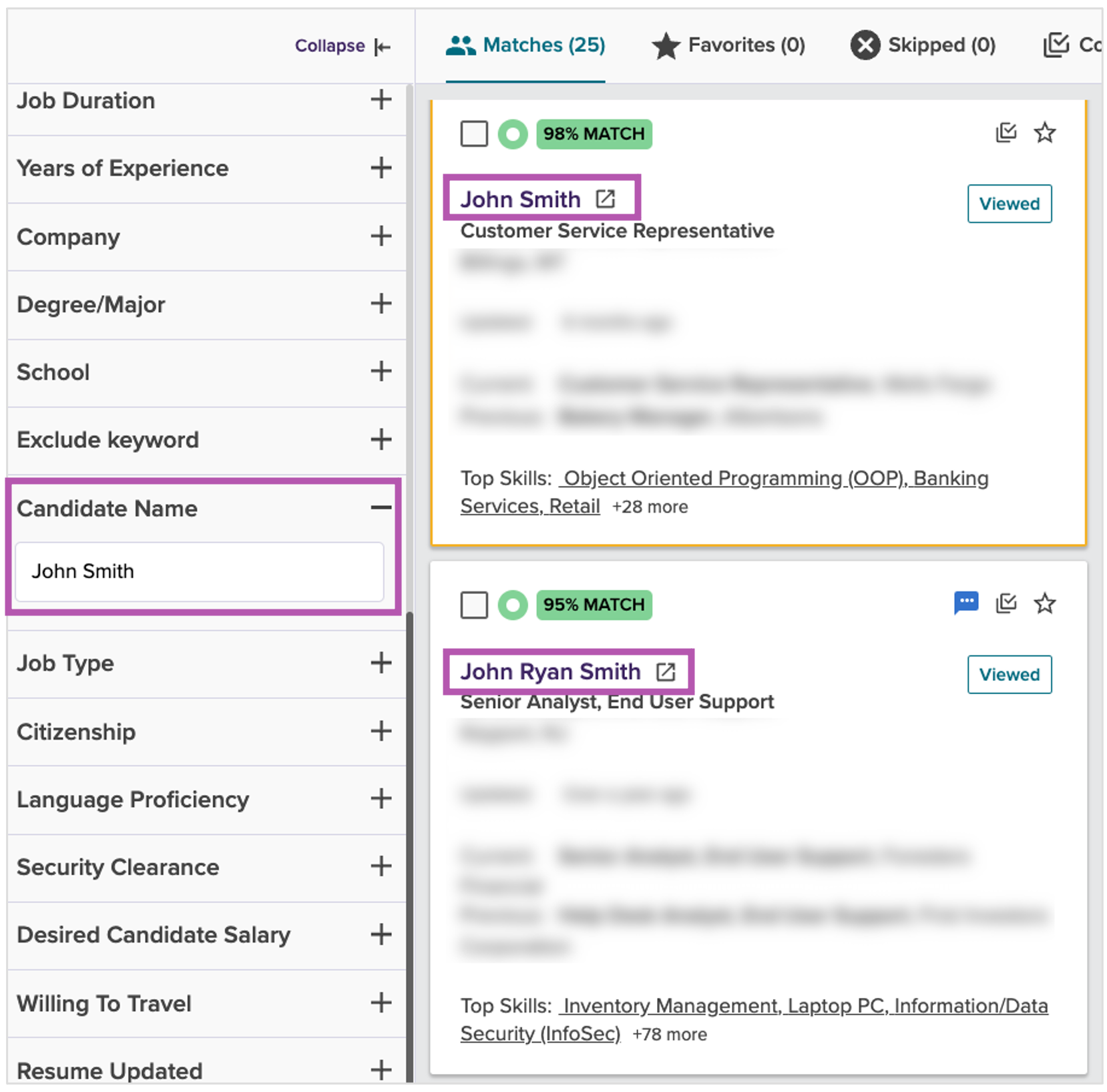 - Search by Candidate Name: Leverage the Candidate Name field in the Advanced Options.