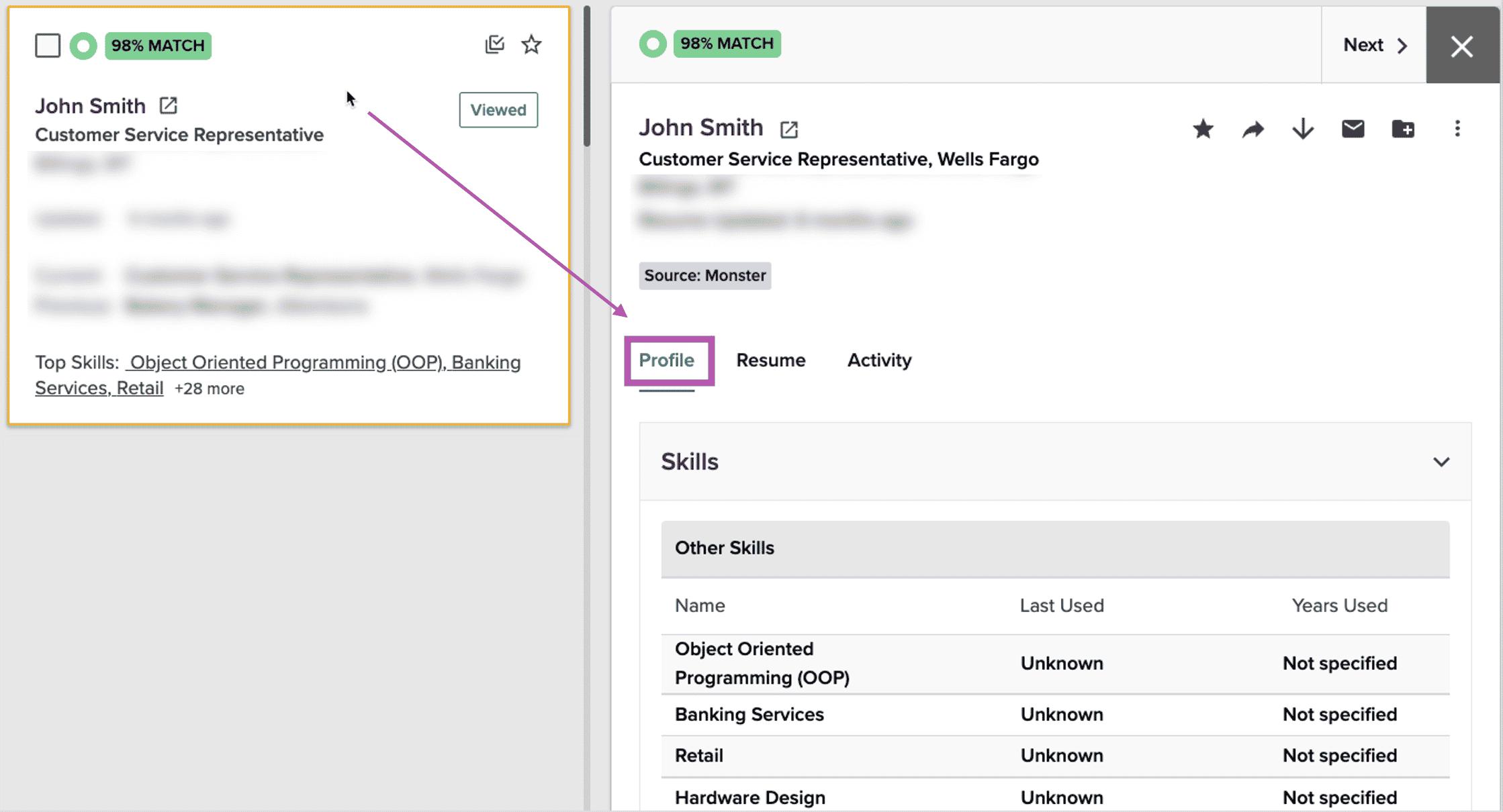 Click on a candidate card to review the candidate Profile without using any of your inventory. The profile is a candidate overview. Highlights include skills, experience, and education; as well as employment information and preferences.