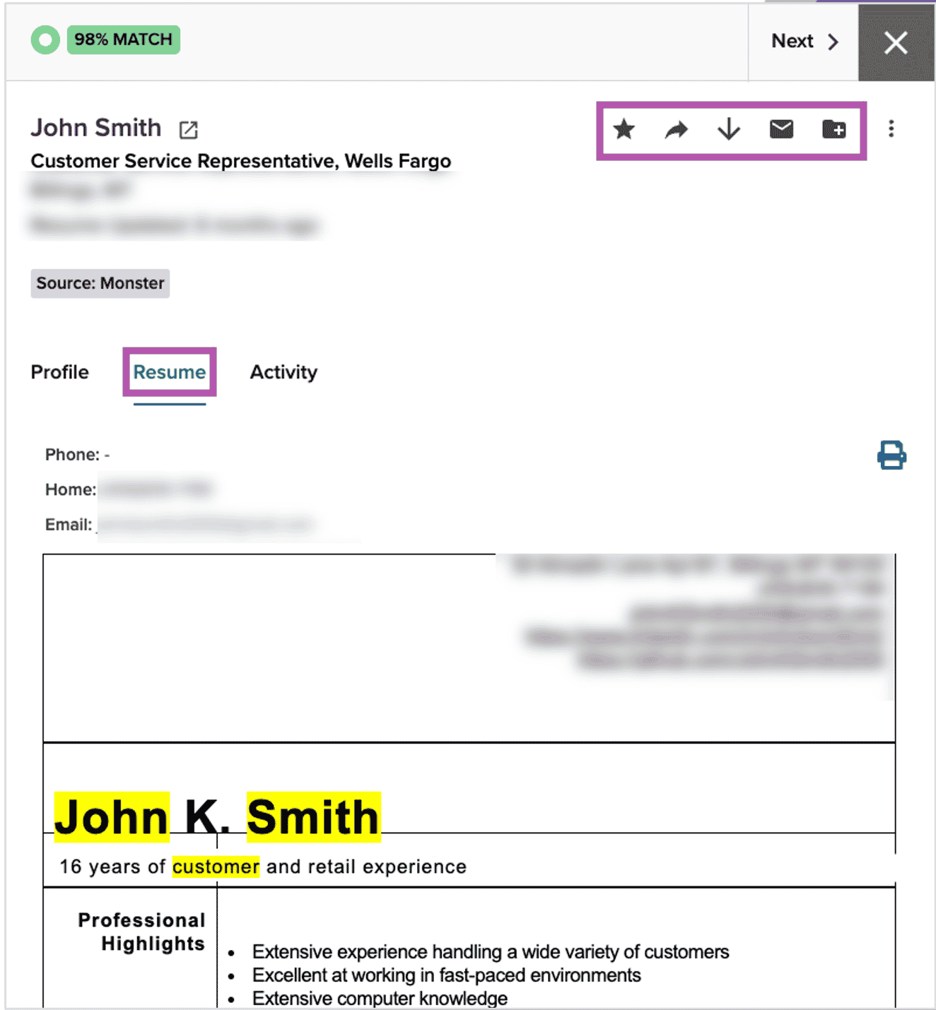 Click on the Resume tab to view the full candidate resume. A candidate’s resume can be downloaded and entered into an ATS, forwarded to a hiring manager, or saved to your network.