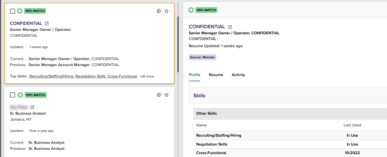 You will be able to see these candidates in search results but their name and contact information will be shown as “Confidential” in the candidate card as well as the Profile view. Although newly updated resumes will be redacted to protect a confidential candidate’s identity, resumes added before July 2023 may contain contact information if the candidate chose not to remove it. You can connect with these confidential candidates through your resume search messaging tools.