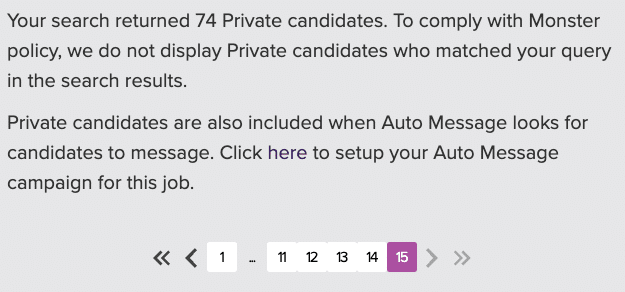 To make sure these candidates are included in your search, make sure to select Include Private candidates from your search options. You will not see these candidates in your list of results but you can contact them through campaign messages. Set up an auto campaign and matched private candidates will receive your message. If they respond, you will gain access to their Monster profile and resume.