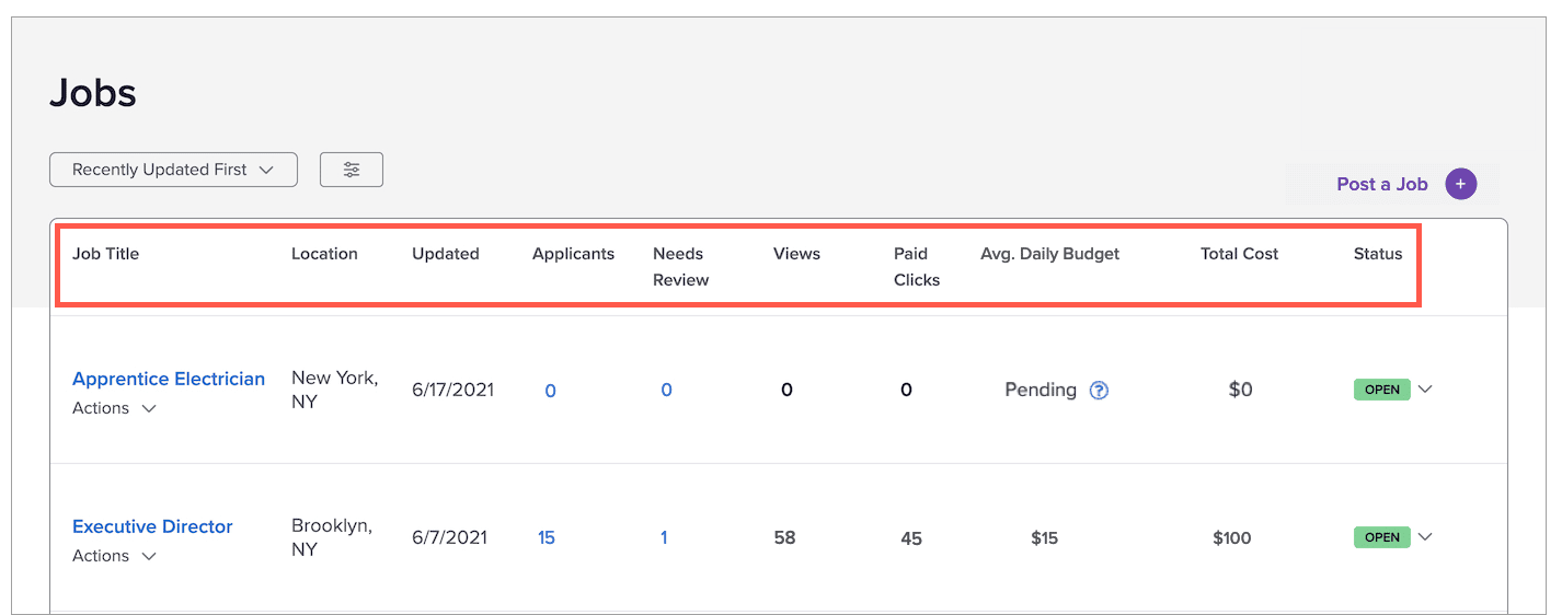 - Status – View jobs based on their status. For example: draft, open, closed, expired.