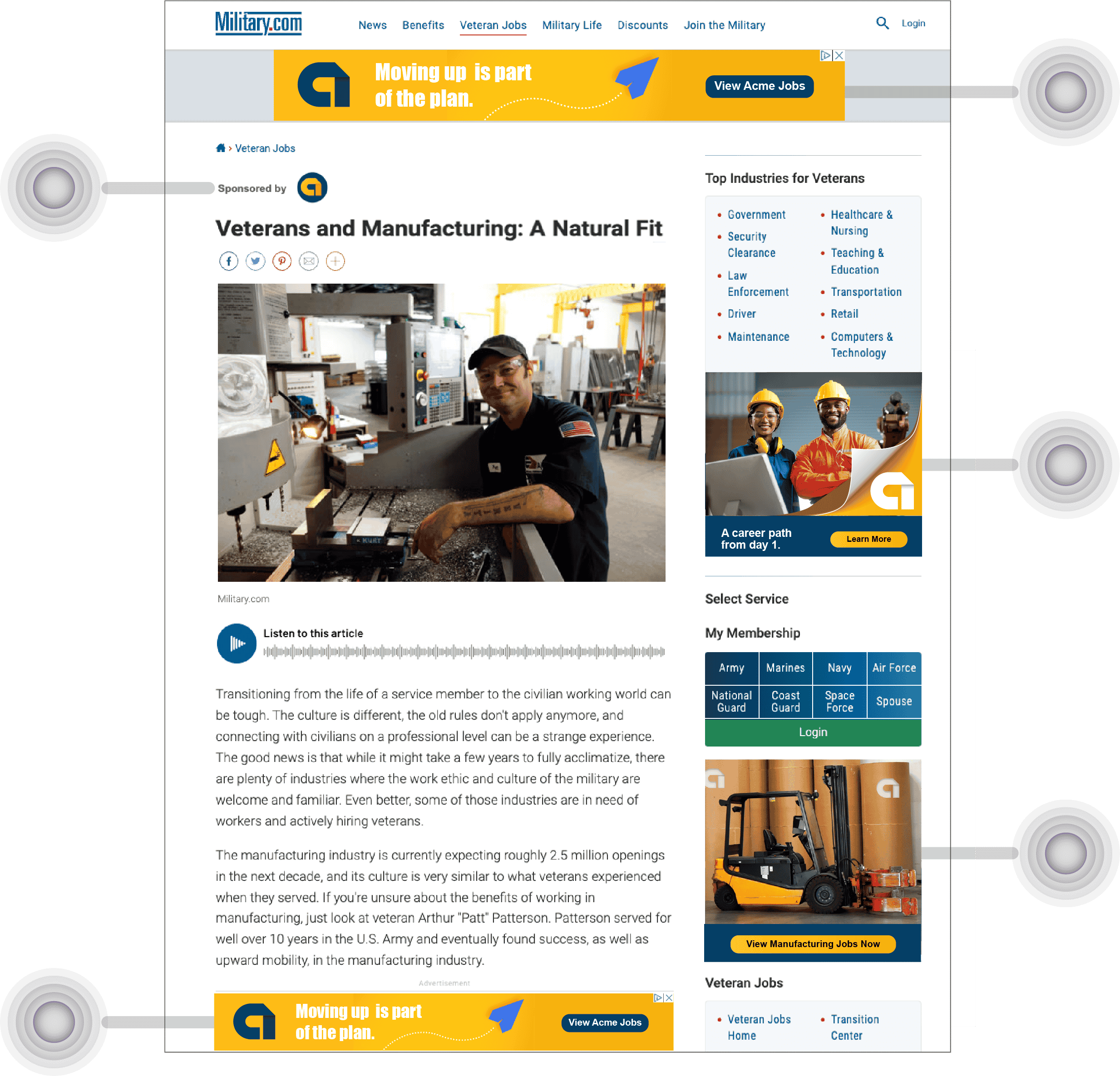 It’s an article takeover and your recruitment brand is center stage! Capture the attention of the highly-engaged Military.com audience and drive qualified traffic directly to your site from multiple on-page ad placements. There are two types of Sponsored Content opportunities – Evergreen and Custom. We’ll outline them below to help you choose the one that’s right for you.