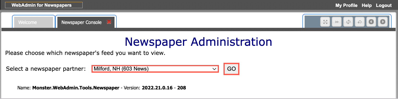 When you log in to Newspaper Admin, you will be taken to the Newspaper Console. Select the partner you want to manage via the dropdown menu, then click Go.