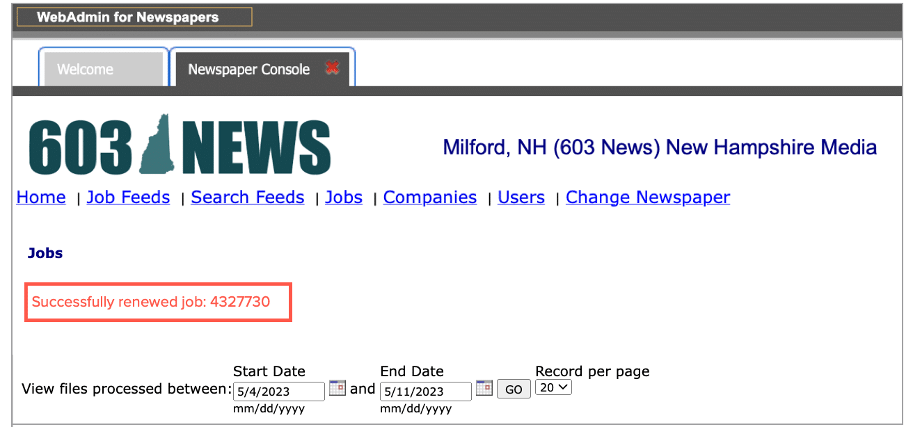 If you would like to look into jobs submitted by the companies you manage, click on Jobs in the top navigation and the page will refresh with a search box. Feel free to select any of the available Search Types and Search Options, enter your search string, and click GO.