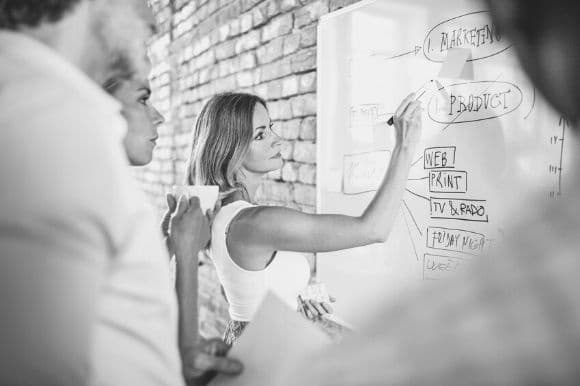 A public relations manager works out a client's strategy, with colleagues, on the white board.