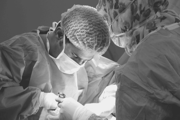 Surgeon and his assistant performing a surgical procedure.