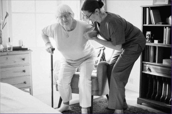 Caregiver helping a client up from a chair