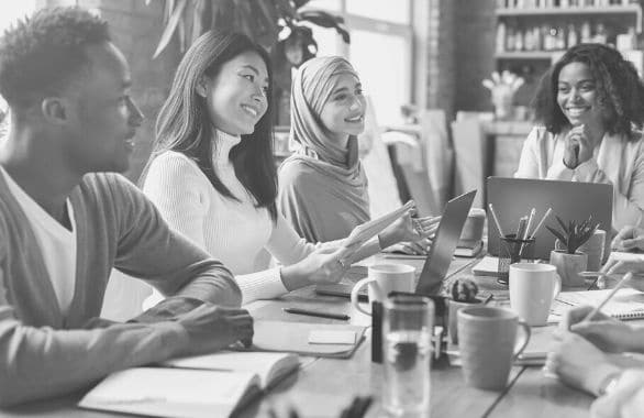 A diverse workforce gathering around a work station, talking and smiling.