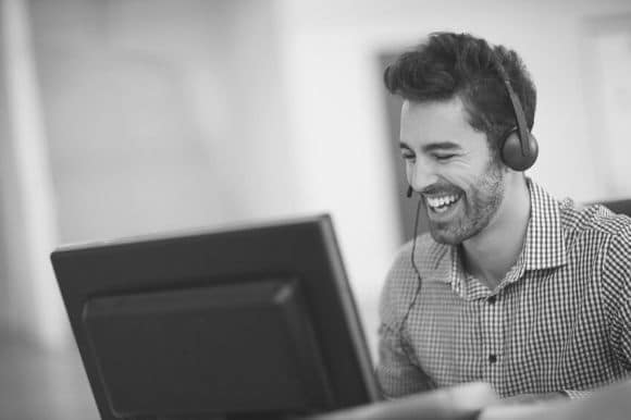 Virtual assistant on the phone with a client, looking at a computer screen.